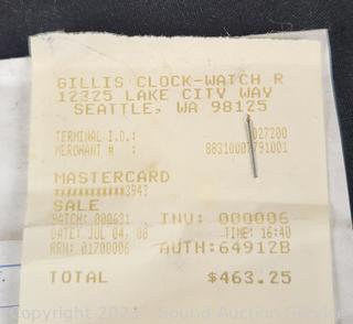 Works. Comes with key and original purchase receipt from Gillis Clock-Watch in Seattle for $463. 34" x 10" x 4.5".