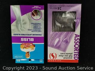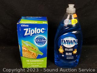 Lot #0018: Assorted Household Tableware, Dish Soap, Gloves, Ziploc Bags
