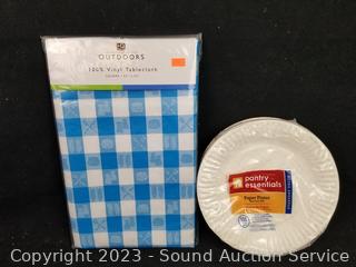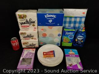 Tablecloth, Tissues, Napkins, Paper Plates, Dish Soap, Plasticware, Gloves, Ziploc Bags. Refer to photos for more info.