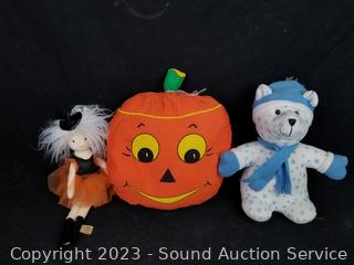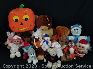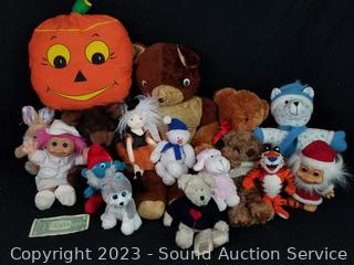Teddy bears, Boyd's bears, Troll dolls, Pumpkin pillow, etc. Refer to photos for more info.
