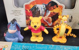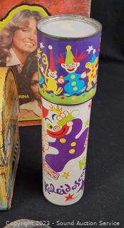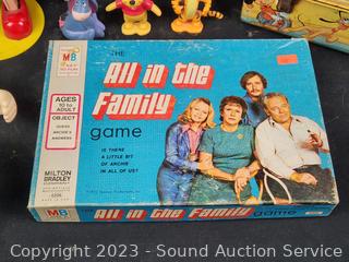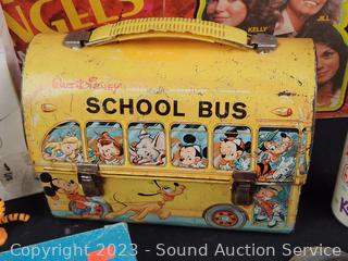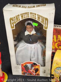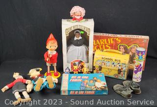 Gone with the Wind, Popeye, Olive Dolls, Kaleidoscope, School Bus Tin Lunch Pail, All in the Family & Charlies Angels board games. Signs of wear from use.