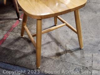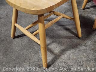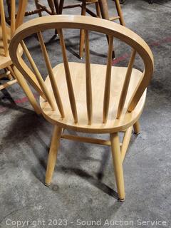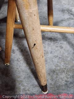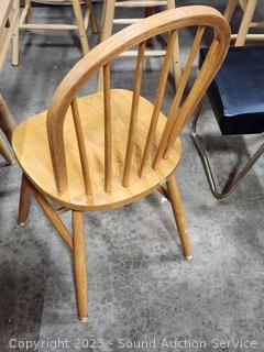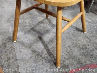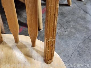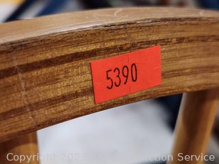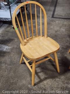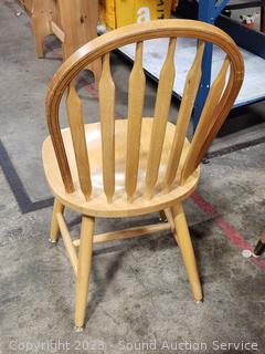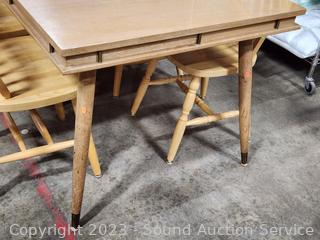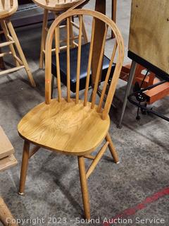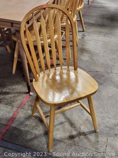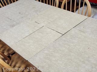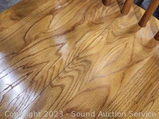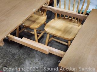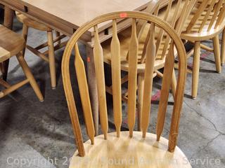 2 of the chairs don't match the rest, one is a different color and other is slat back instead of spindle back like the majority of the chairs. None of the chairs match the table. 30" H x 54" x 36" W table with (2) 11.5" leaves. Comes with felt tabletop protector. Various wear to the finish on the legs of the table, top is in great condition.