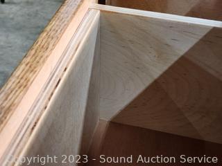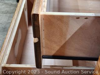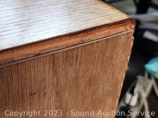 Roller drawer guides, plywood construction, oak finish veneer finish. Overall great condition. 21" H x 23" W x 16.75" D.