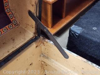 Missing the leather handles, no tray insert. Hardware appears to be intact, no key. Various wear to finish, olde patina. 24" H x 36" L x 21" W.