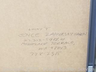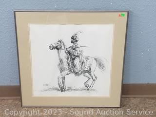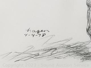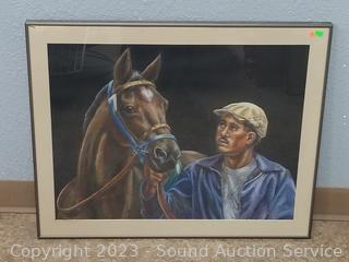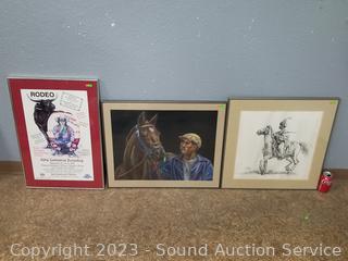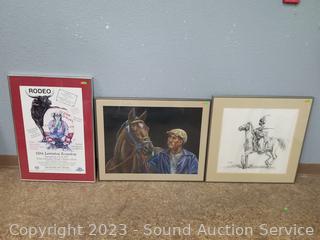 Signed Hagen Horse Rider sketch, dated 4-4-78, 23" x 23". Rodeo 65th Lewiston Roundup 1999 poster, 27" x 19". Original Horse & Trainer signed J. Zahursky 1987, 22" x 27".