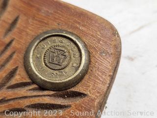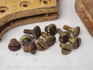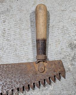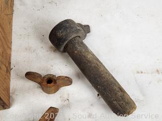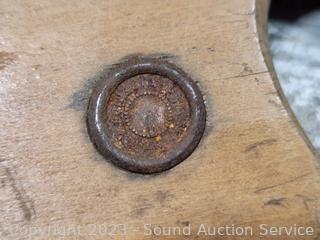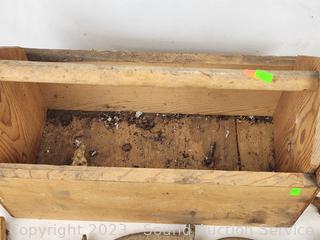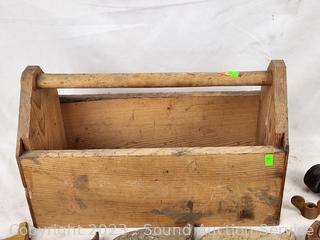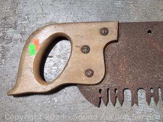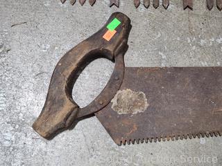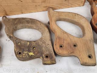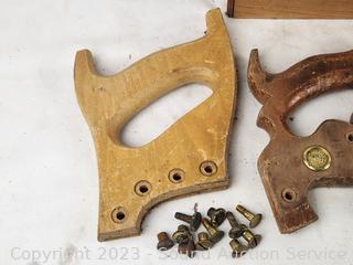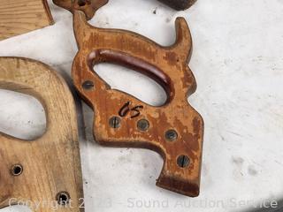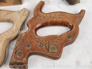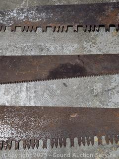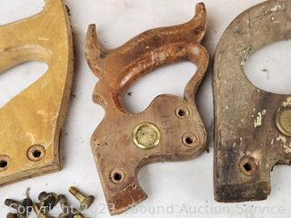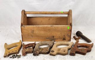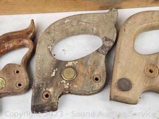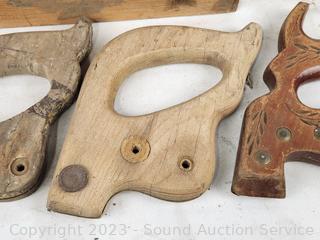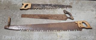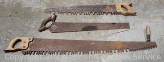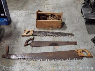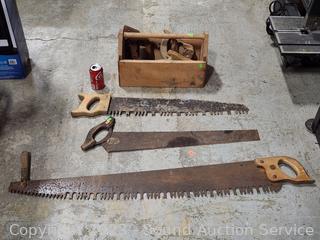 Lot #0079: 3 Vintage Rustic Crosscut Saws & Wood Tote w/Various Saw Handles