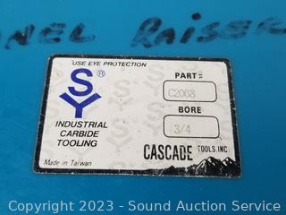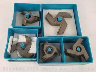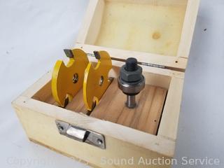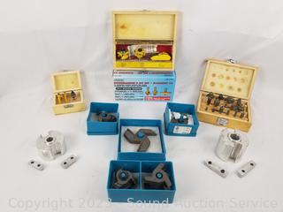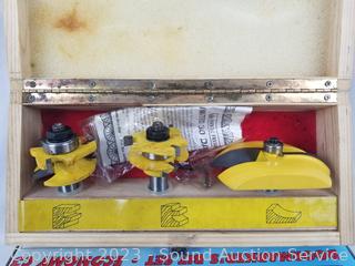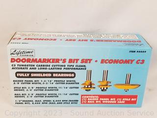 Door markers bit set, various shapes & sizes. Panel Riser, Panel back Cutter, Stire E Rail, Miter Lock, etc. Refer to photos for more info. Most appear to be 3/4" bore.