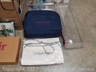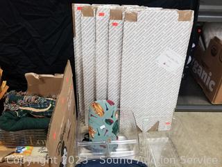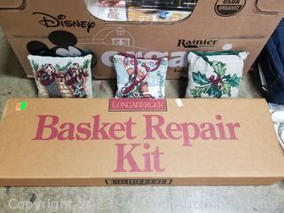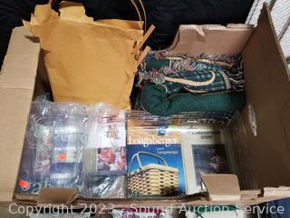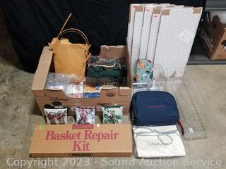 Basket repair kit, plastic liners, gift boxes, throw blanket & more. Refer to photos for lot contents.