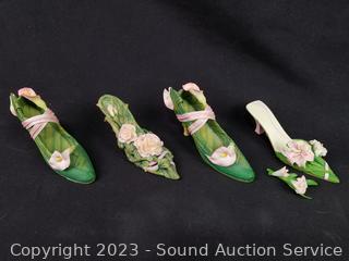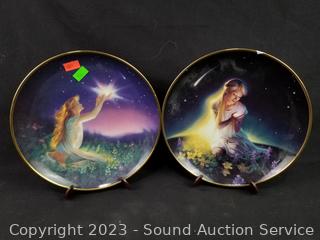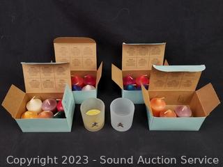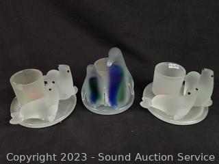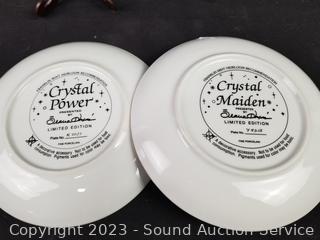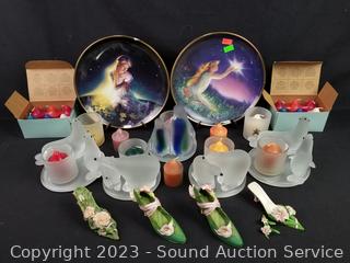 2 "Crystal Power", "Crystal Maiden" Collectors plates with plate stands, 4 "Just the Right Shoe" figures, 5 Seal Votives (1 is missing part of it's nose), assorted Partylite votives.