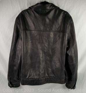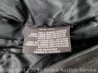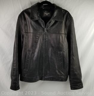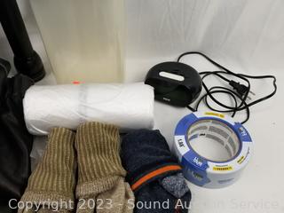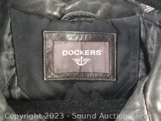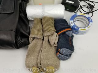 Trash bags, alarm clock, Dockers leather jacket S:M, Maglite, socks.