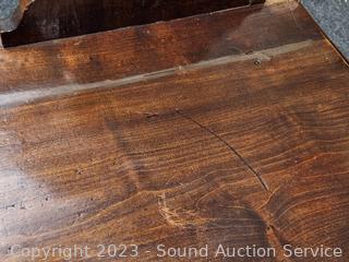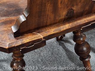 Handcrafted, well made. One of the slots in the seat that the back support slots into has been repaired. Some scuffs from use, olde patina. Overall great condition. 40" H x 18" W x 19" to seat. Would go well with the dining table set Lot #2.