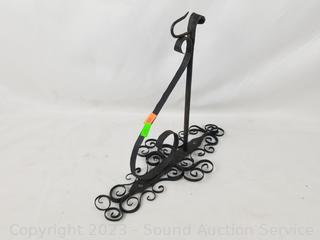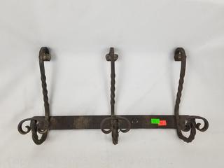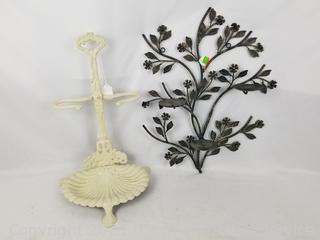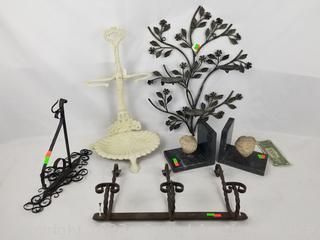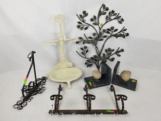One bookend has a loose piece. Plant hanger bracket, 3 wrought iron hooks, candleholder, scalloped stand.