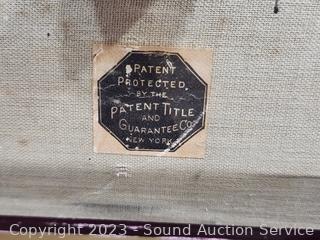 Right leather handle is damaged, leather straps are broken/missing, hardware all appears intact, inserts comes with original hardware that lifts them as lid is raised. 22.5" H x 34" x 20". Refer to photos for more info.