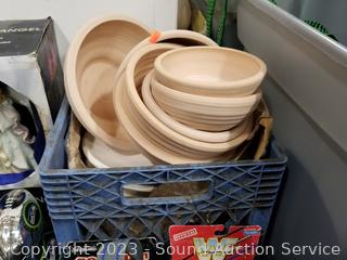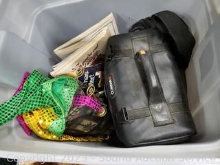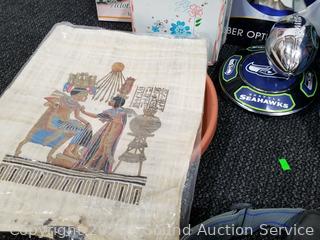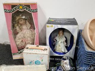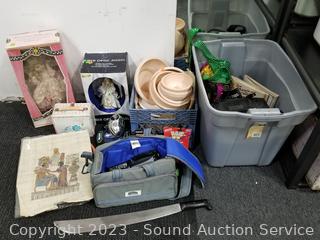Pottery bowls, plates, porcelain doll, fiber optic angel, machete, lunch pail, camera bag & more. ATTN: Items may be missing pieces, damaged, not functioning, complete, no issues, etc. All items as is. Refer to photos for lot contents.