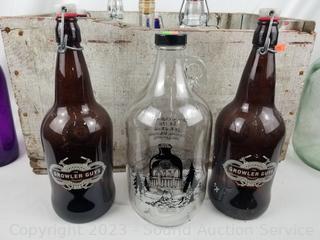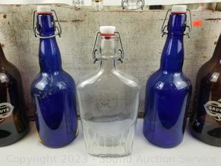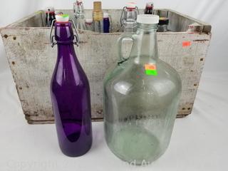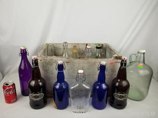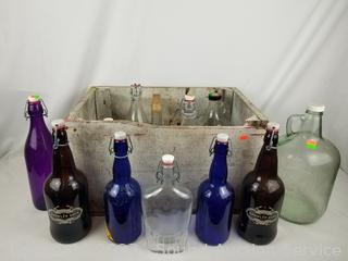 11" H x 19" x 12.25" crate, purple blue, clear, brown bottles with caps/lids.