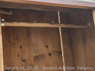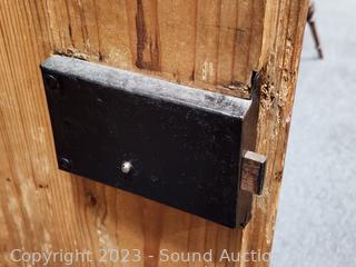 Skeleton key lock with key. Approx. 64.5" H x 44.5" W x 20.5" D. Door won't letch shut, (too much spacing). Various scuffs, wear to finish from age, use.