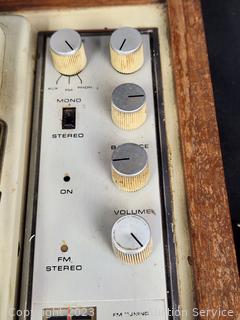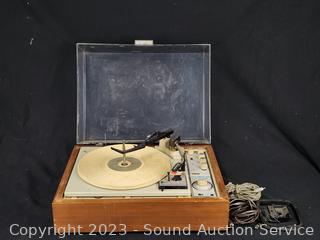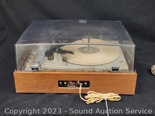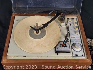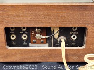Has power, turntable spins, no speakers for proper test. Faceplate, labels are loose. Various cosmetic wear.