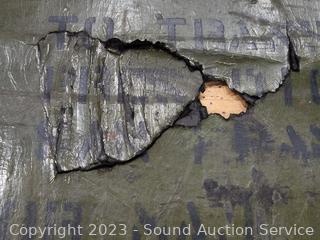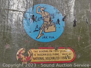 Locked closed, no key, feels empty. Missing leather handle and hardware on one side. 31.5" x 16" x 12.5". Print on the lid, refer to photos for more info.