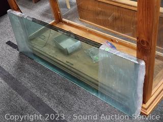 Doors and shelves are not assembled, comes with hardware, no lock (we did not want to have to assemble just to disassemble again). Frame has a crack. 3/8" thick glass shelves, one door has a chip on edge, missing 4 of the 1x2" wood slats that secure shelves, does have adjustable shelf pegs but don't believe these shelves fit with just the shelf pegs alone. 47.25" L shelves, 48" wide shelf space. Approx. 72" H x 52" W x 20" D.