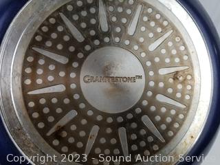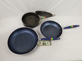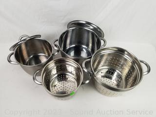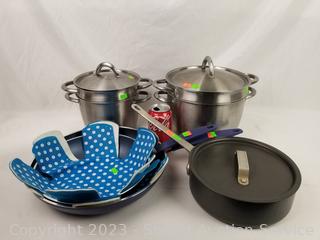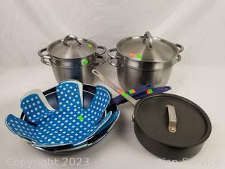 Ikea stainless double boiling pots w/lids, 7.5" & 9" Dia, Commercial Aluminum 2qt fry pan w/lid, Granitestone 10" & 12" skillets, with cloth pan cozy's. Signs of wear from use.