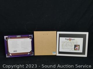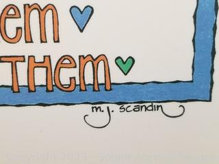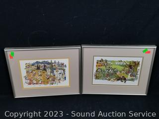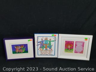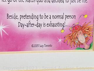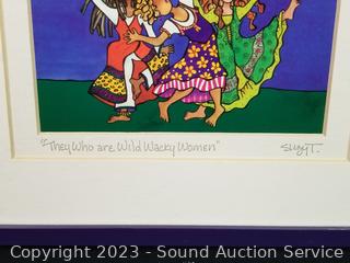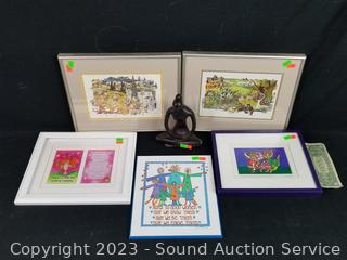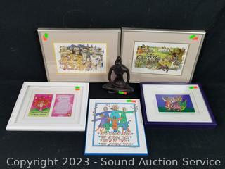 Suzy Toronto "They Who Are Wild Wacky Women", Pretending To be Normal" prints, 8" x 10", art & artist information on the back. M.J.Scandin Plaque, 8.5" x 9.5". 2pc Country/Folk Art Prints, 10" x 12.5". Sculpture 8" tall, don't see any makers marks.
