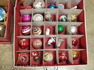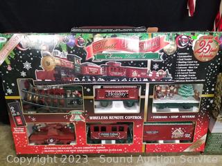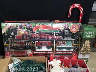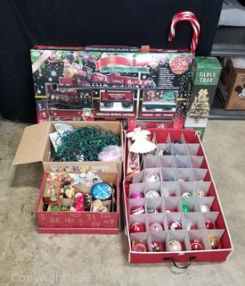 46pc North Pole Express Elec. Train Set, appears complete, over 25ft of track, ornament storage box w/various ornaments, candy cane stake lights, table tree & more. Refer to photos for more info.
