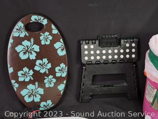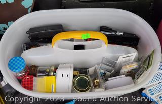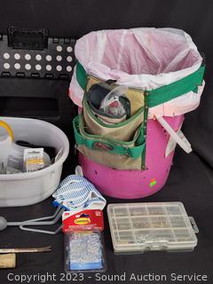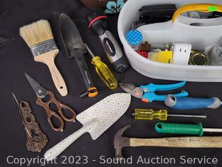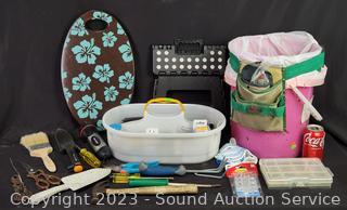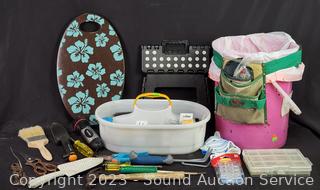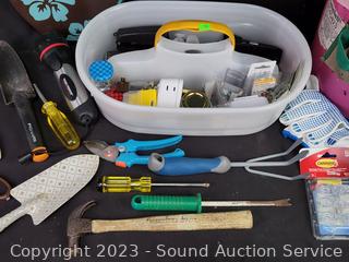 5 Gallon tool bucket, utility tote, small collapsible step stool, garden hand shovel & cultivator, hammer, flashlight pruners, gloves, paint brush & more. Refer to photos for more info.