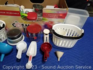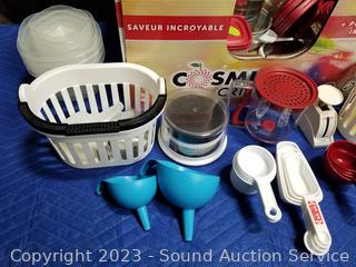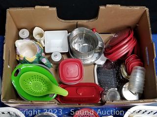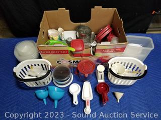 Measuring cups, food storage containers w/lids, colander, baster brush, butter dish & more. Refer to photos for more info.