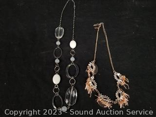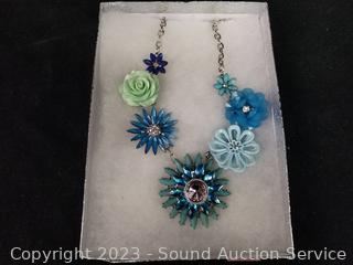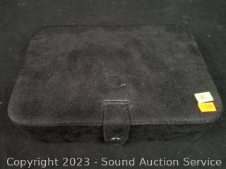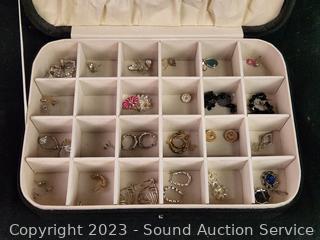 2.5" x 10.5" x 7.25" jewelry box. Various earrings, necklaces. Royal Secret & White Shoulders perfume.