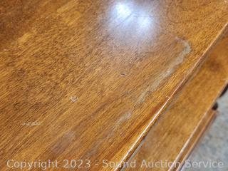 Various scuffs, wear to finish. 23" H x 27" W x 11" to 12" D. Embossed burnt makers mark on the bottom.