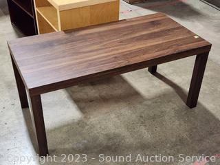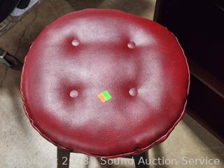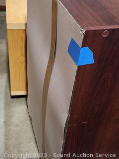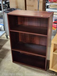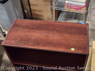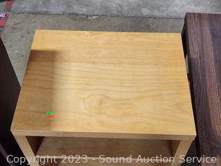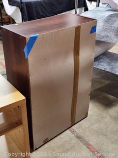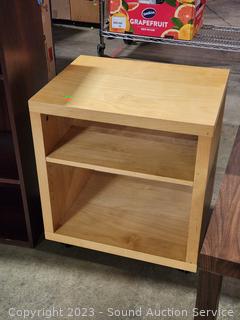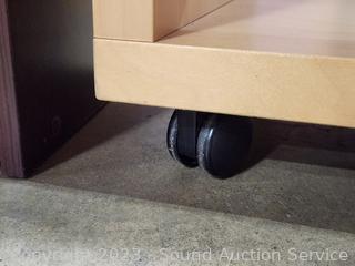 Maple Veneer rolling table, 22.25" H x 20-3/8" W x 15.75" D. Wood Grain Laminate Coffee Table 17.5" H x 39" L x 19" W. Wood Grain Finish Bookcase 35.5" H x 24.5" W x 11.5" D. Stool 24" H x 14" Dia.