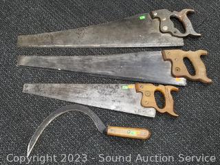 Hand scythe 17" long overall, E.C.Atkins & Co. 26" handsaw, Keystone Air Master 20" handsaw & other 26" handsaw. Various wear, patina from age, use.