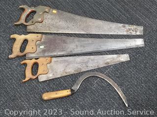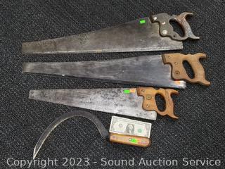 Lot #0185: 3 Vtg. Crosscut Handsaws & Hand Scythe