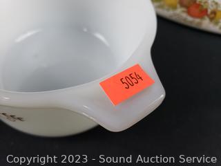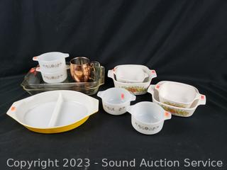 4pc Pyrex Dynaware 2.5" x 4.5" souffles, yellow divided dish, 2 clear 8x12" baking dishes, (2) 2-3/4 cup, 1qt & 1-3/4qt vegetable print dishes. Signs of wear from use.