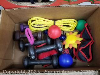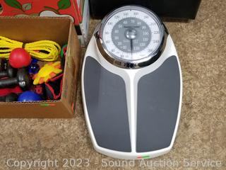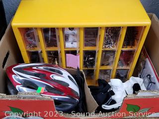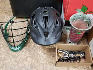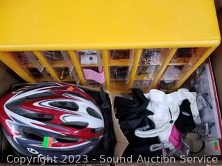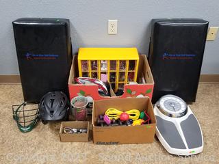 Self Defense training pads, bicycle helmet, hardware organizer w/hardware & hole bits, lacrosse helmet, fitness dumbbells, anolog scale & more.