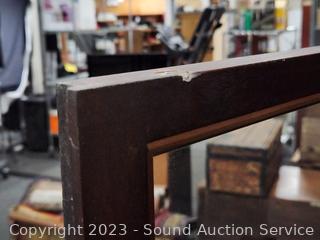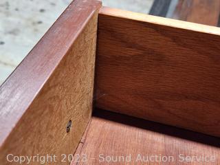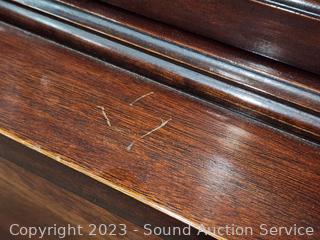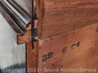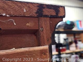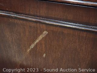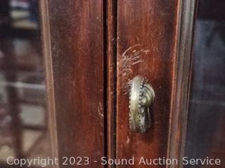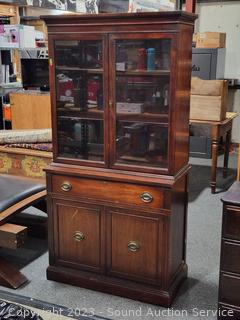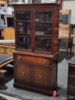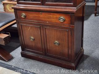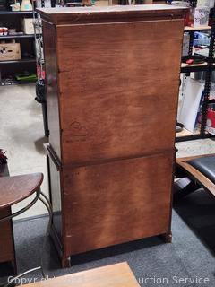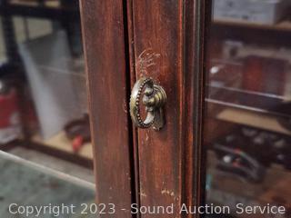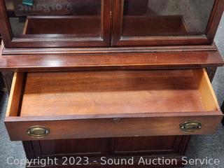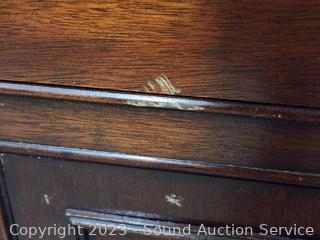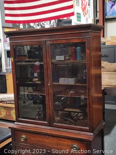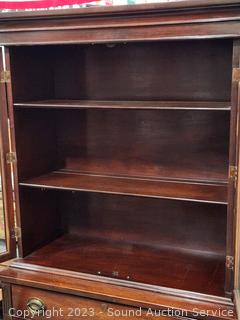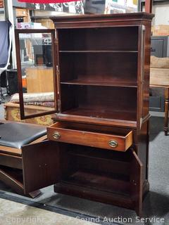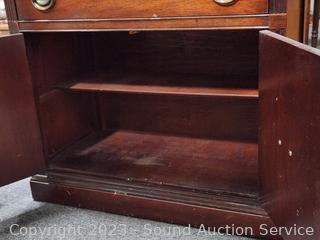 Single drawer lower cabinet, 2 shelves with plate grooves. 69" H x 35" W x 14" to 17" D. Some scuffs, scratches in finish, overall good condition. Solid wood construction.