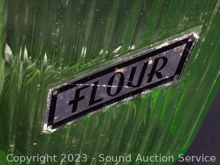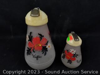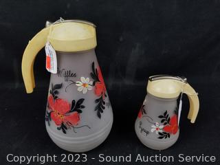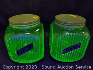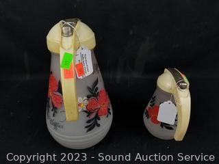 Canisters are labels Flour & Cereal, glow under UV light. The Pitchers look too be hand painted.