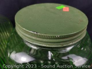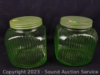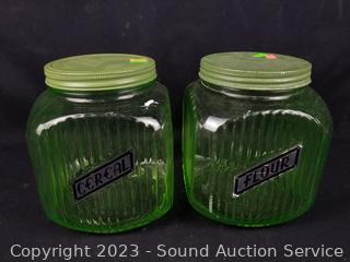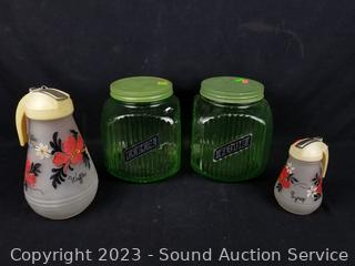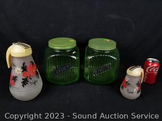 Lot #0195: Hazel Atlas Frosted Waffles & Syrup Pitchers & Uranium Glass Canisters