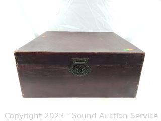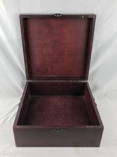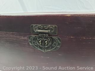 Made almost entirely of seashells, 18" x 12". Wood chest has some scuffs, 7.5" x 18" x 18".