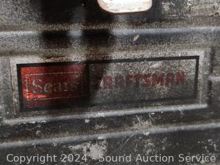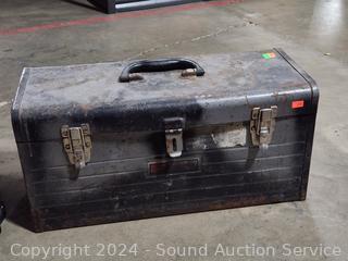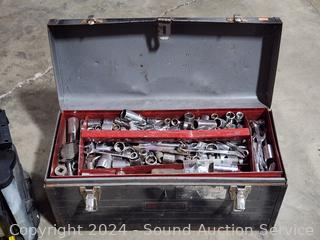 Vtg. hand tools, precision polisher, ratchet strap, riveter, 20" organizer 10" H x 20" x 10", 20" steel rustic toolbox full of sockets & other tools. Refer to photos for more details.