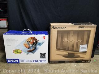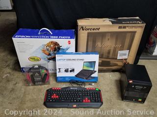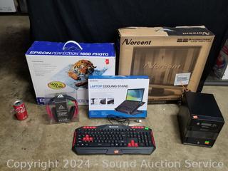 Norcrest 22" LCD Monitor (has power), Epson 1660 Photo Scanner (has power), Merkury Laptop 9-17" Cooling Stand, iBuyPower (works), Audio Council DJ Edition Headphones, Buffalo T-Z8.0TL/R5 Computer (no key, won't stay on). If not mentioned, it is untested .