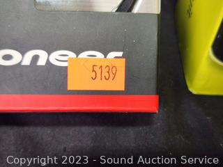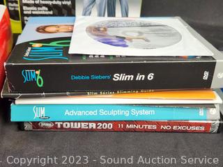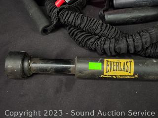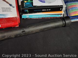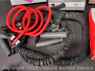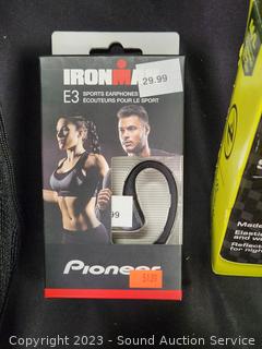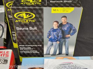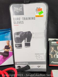 Elastic bands, 29" bar, Pioneer Iron Man Sports Earphones, Core Training Gloves, 2 Sauna Suits S:M/L, several workout videos.