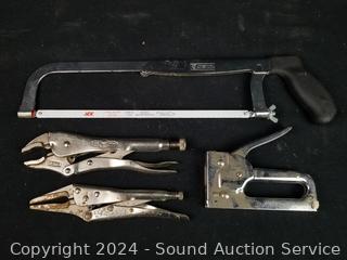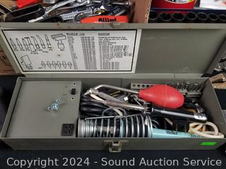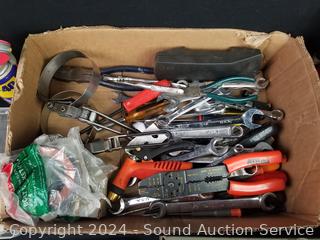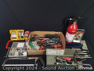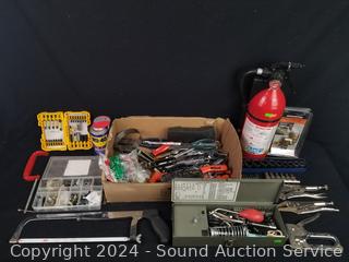 Soldering iron set, Kidde fire extinguisher (full, charged), hacksaw, pliers, wrenches, filter wrenches & more. Refer to photos for more details.