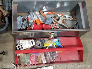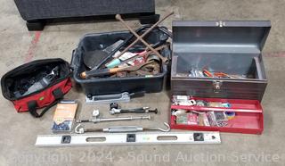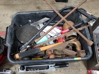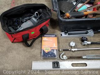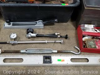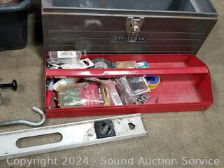 3ft level, handsaws, planes, chainsaw chain, 18" Craftsman toolbox with clamps, magnets & hardware. Refer to photos for more info.