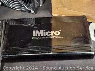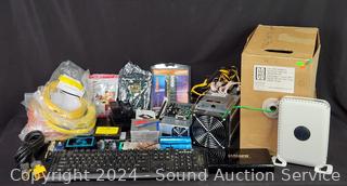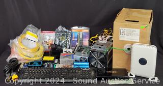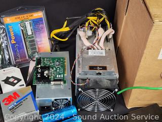 Netgear router, 256MB RAM, external hard drives, network, audio cards, various cables, Antiminer V9, keyboard, box of 350Mhz green Giga-Link cable & more. Refer to photos for more details.