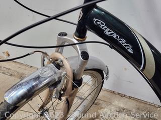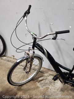 Rear rack, grip shift (works), rear brakes don't appear to be working, front brakes work, front fender & suspension. Other than the rear brakes everything appears to be functioning as intended. Some minor weathering wear from use. Approx. 70" long, 27" wide.