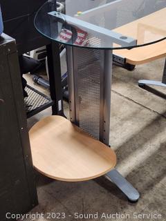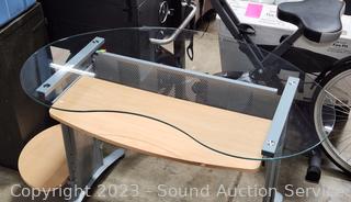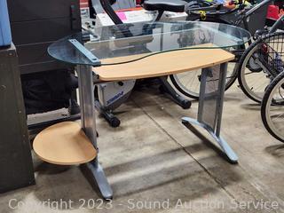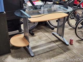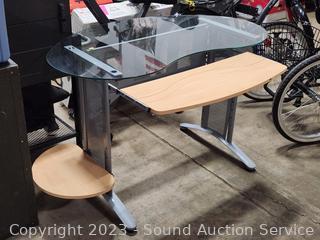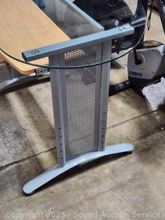 30" H x 47" W x 29" D. Front left facing foot for glass top has fallen and loose in the hole, some minor scuffs on legs, don't see any other issues. Refer to photos for more details.
