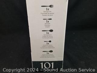 includes 24 salad forks, 12 dinner forks, 12 dinner knives, 12 dinner spoons, 24 teaspoons, 12 coffee spoons, 5 serving pieces. Doesn't appear to have ever been removed from packaging.