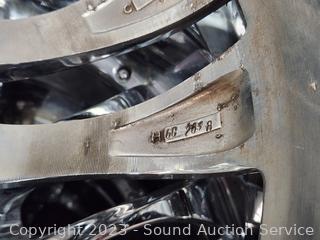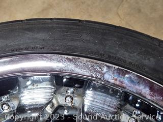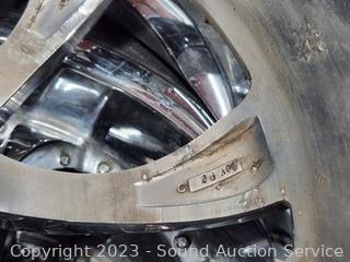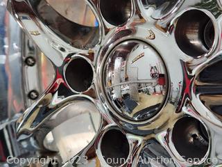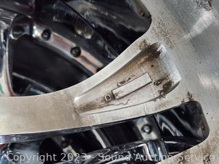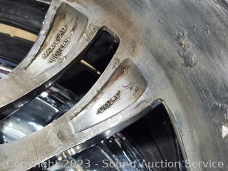 "H" Chrome rims have some scuffs, rust spots, wear to finish. Nitto NTSSS tires, one tire is missing significantly less tread than the others., the others have plenty of tread to be functional, one has a screw in it. Also come with all the lug nuts. DOT N38P.