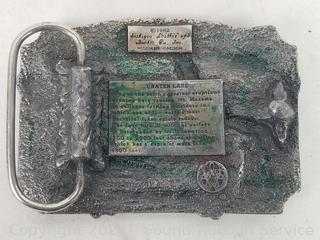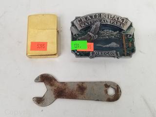 2003 Zippo, 1982 Pewter Crater Lake Oregon belt buckle. Various wear to skates, musty odor, don't see a size approx. S:7-8. 5.5" x 15" x 11" chest. Refer to photos for more details.